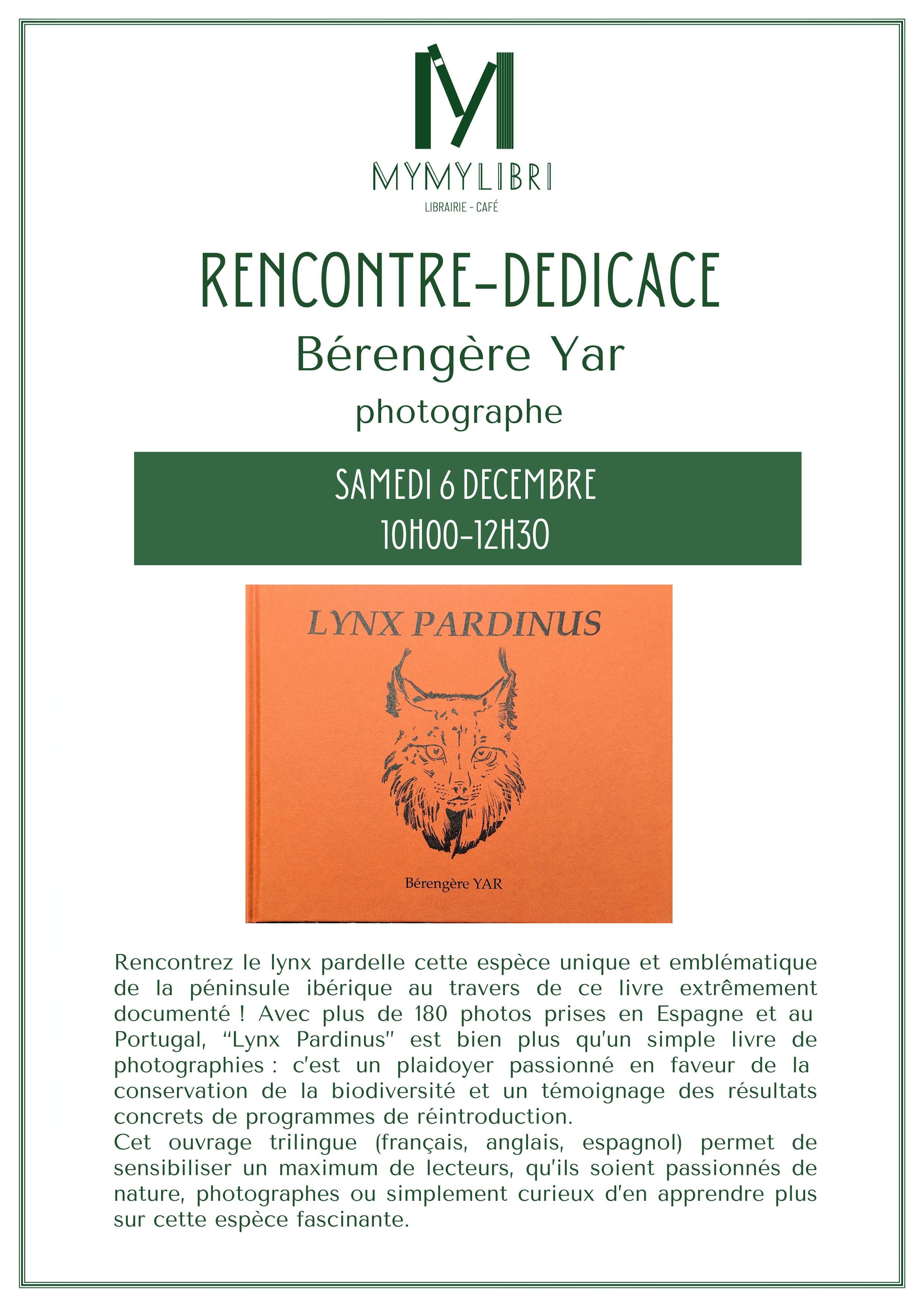 Samedi 6 décembre de 10h à 12h30, retrouvez Bérengère Yar, naturaliste et photographe animalière passionnée pour son ouvrage Lynx pardinus.