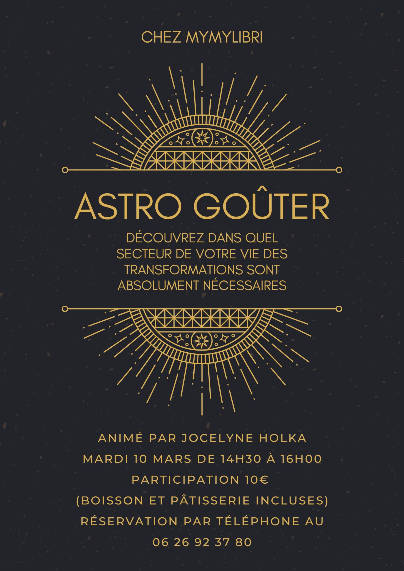 De 14h30 à 16h, autour d'un goûter, venez poser vos questions astrologiques à Jocelyne, à partir de votre thème astral. Cet atelier est sur réservation et participation de 10 euros.