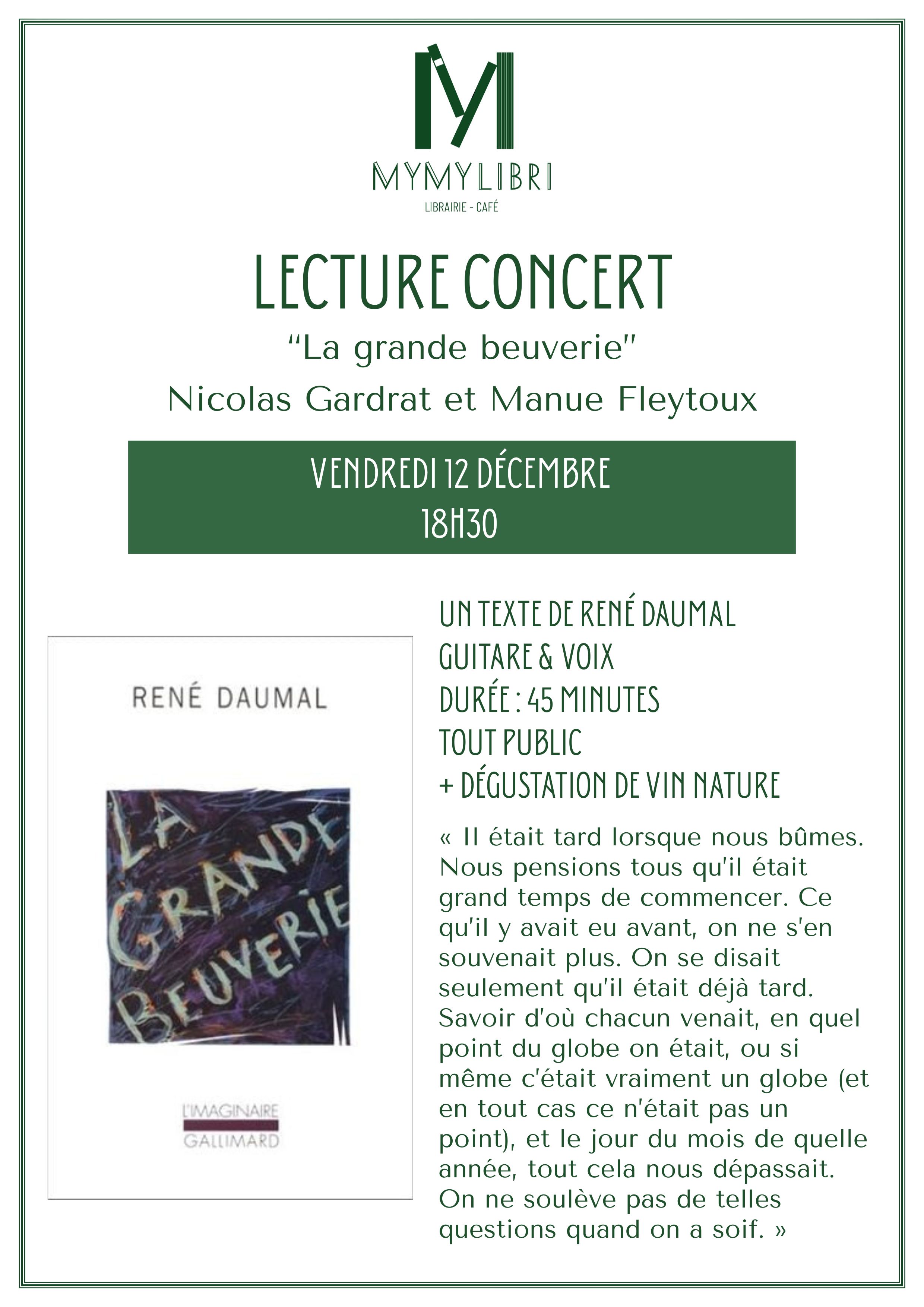 Vendredi 12 décembre à 18h30, la compagnie L'Oeillère vous présentera une lecture musicale du texte de René Daumal : La grande beuverie. Cette soirée est sur réservation et sur participation au chapeau !
